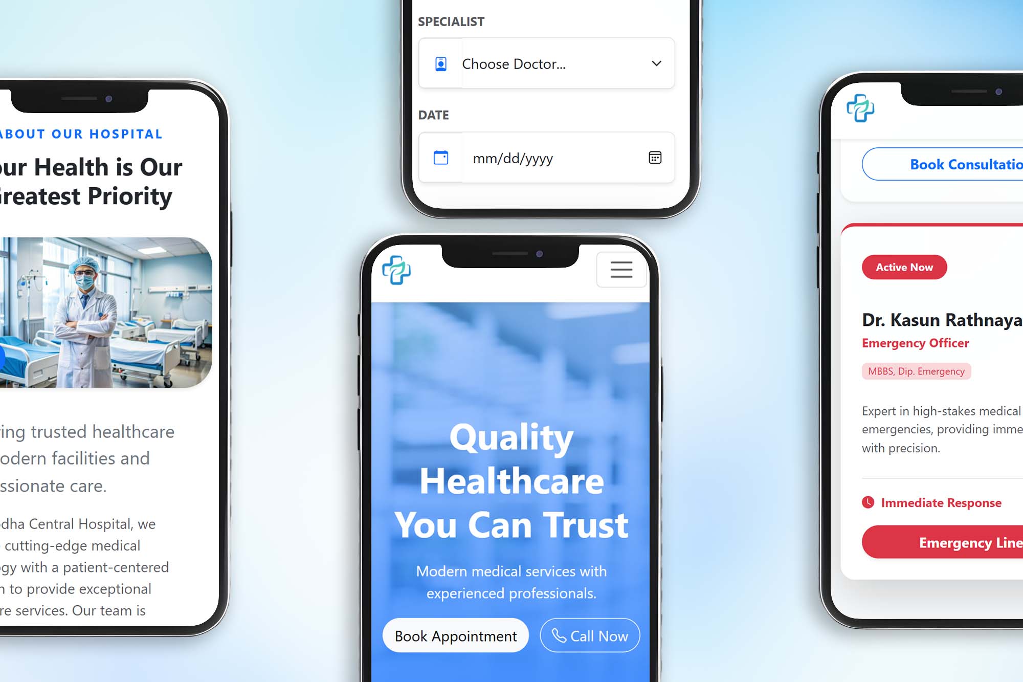 This is a modern, responsive healthcare website for Prabodha Central Hospital, providing easy access to hospital services, doctors, departments, careers, and contact information with a user-friendly and accessible design for all devices.